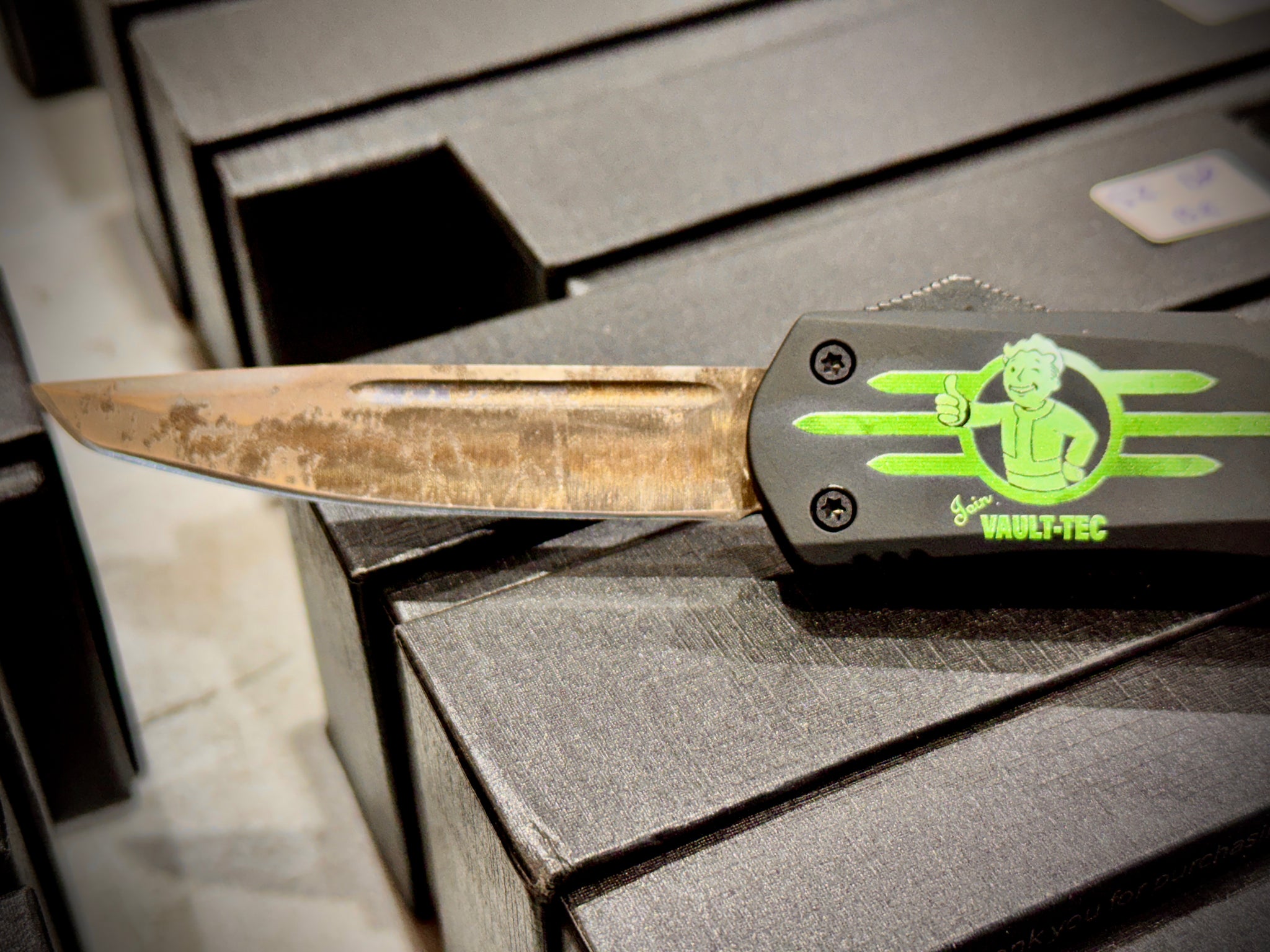 Gen II | Black & green Pip-Boy handle | One-off hybrid Tanto/Drop-point blade with a cosmic design and raw, rustic finish.